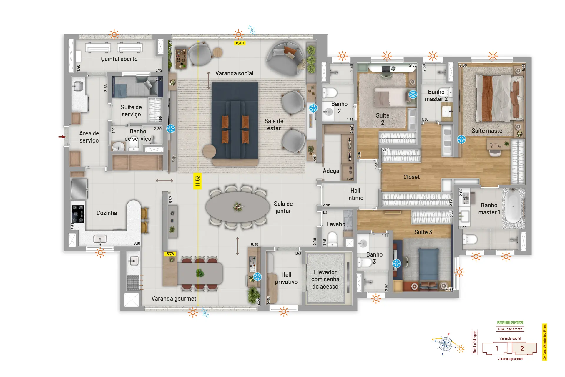 De um lado, a varanda gourmet; do outro, a varanda social, com vista para o Jardim Botânico. As duas varandas trarão muita iluminação e ventilação natural, proporcionando mais circulação de ar e saúde para você e sua família. Serão mais de 13 metros de uma varanda à outra.