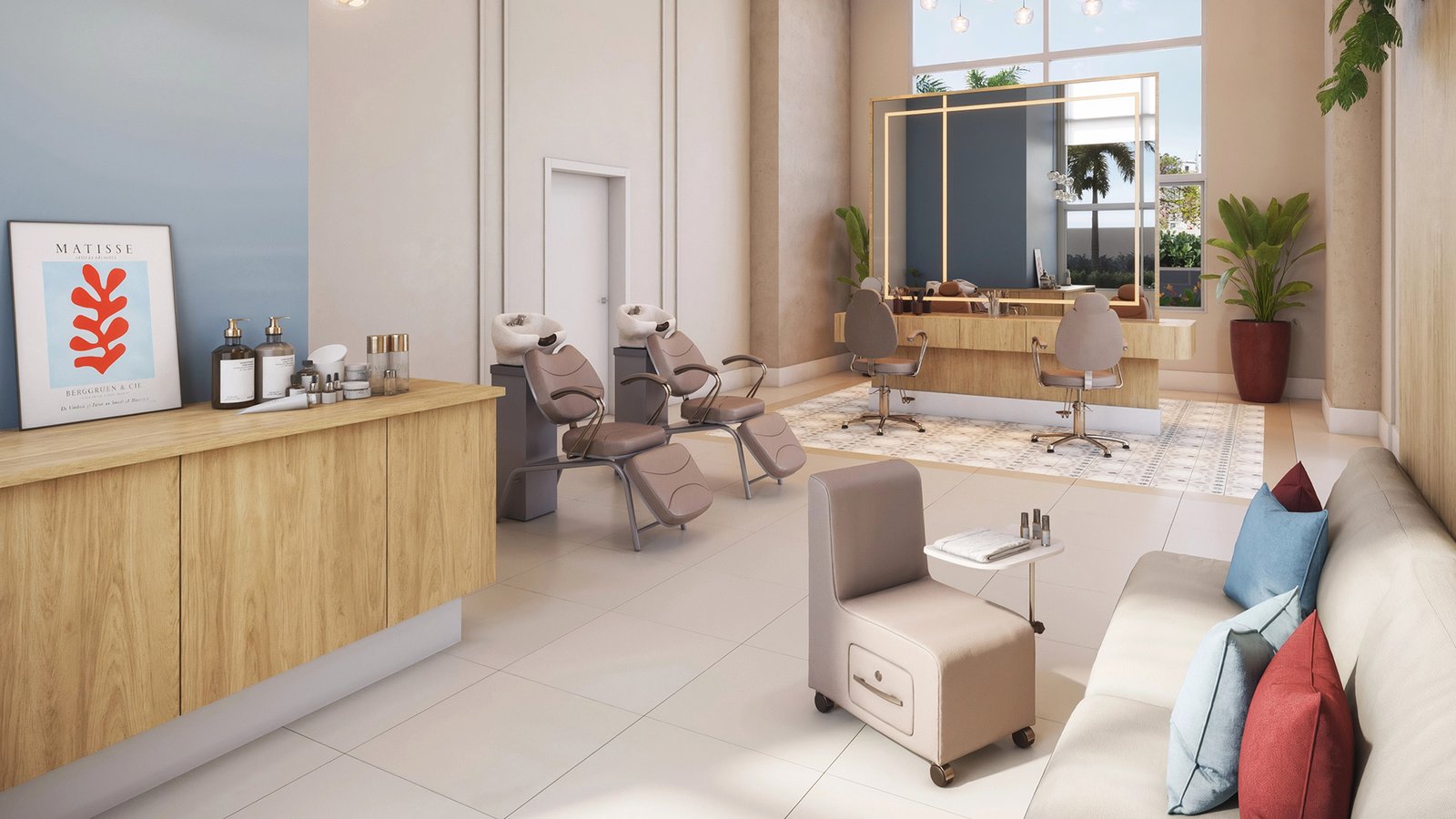 Este é o espaço dedicado a cuidar da aparência e da beleza, com toda a infraestrutura para fazer cabelo, unha, barba e maquiagem.
