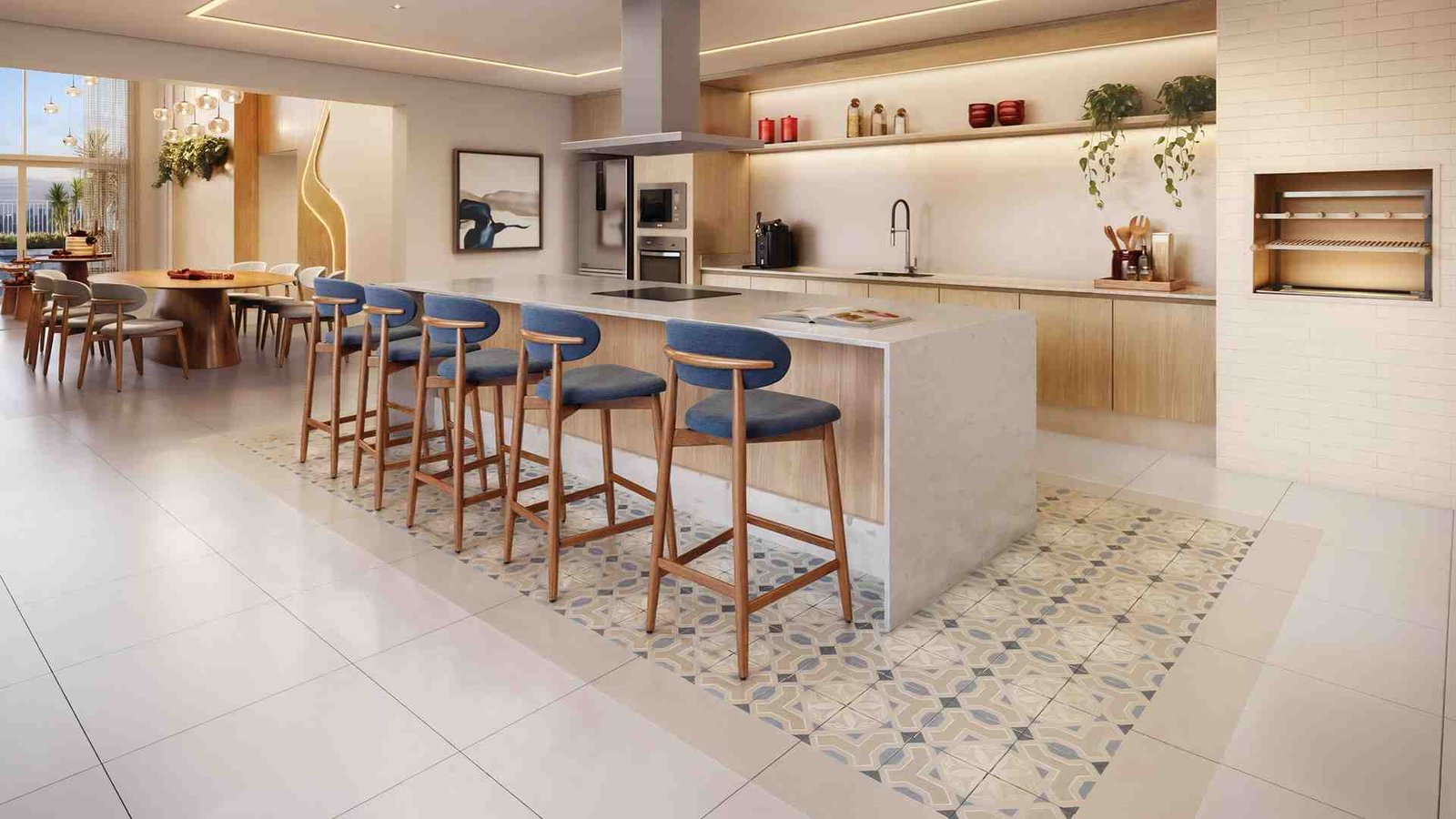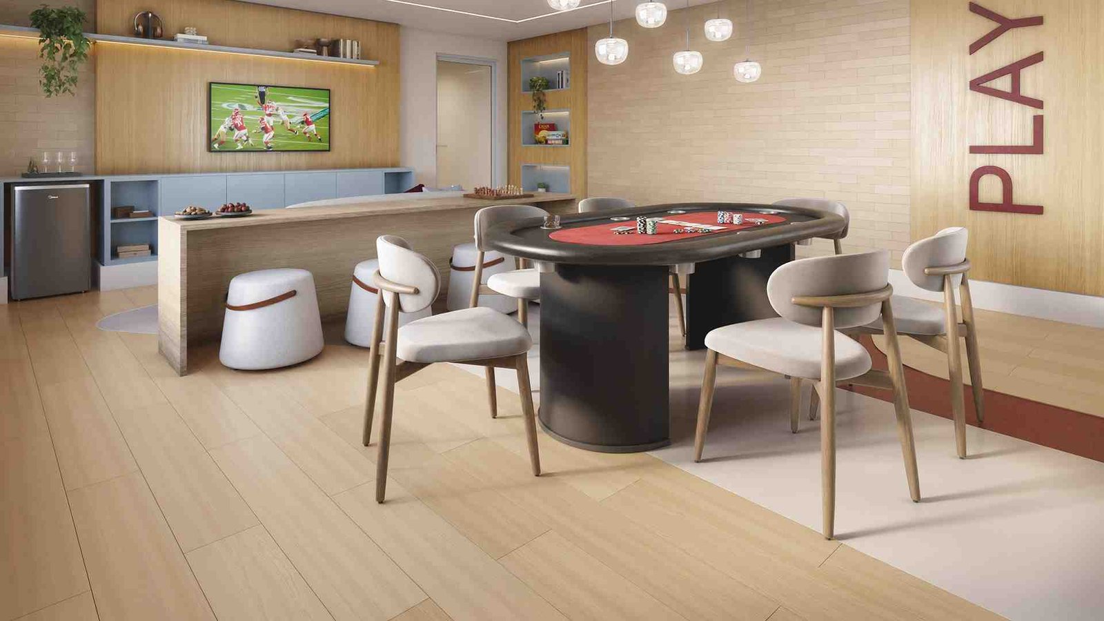 O apartamento inteiro será entregue com piso instalado. Nas salas, cozinha, varandas, banheiros, lavabo e área de serviço, será piso porcelanato 90x90cm. Nas suítes sociais, será piso vinílico.