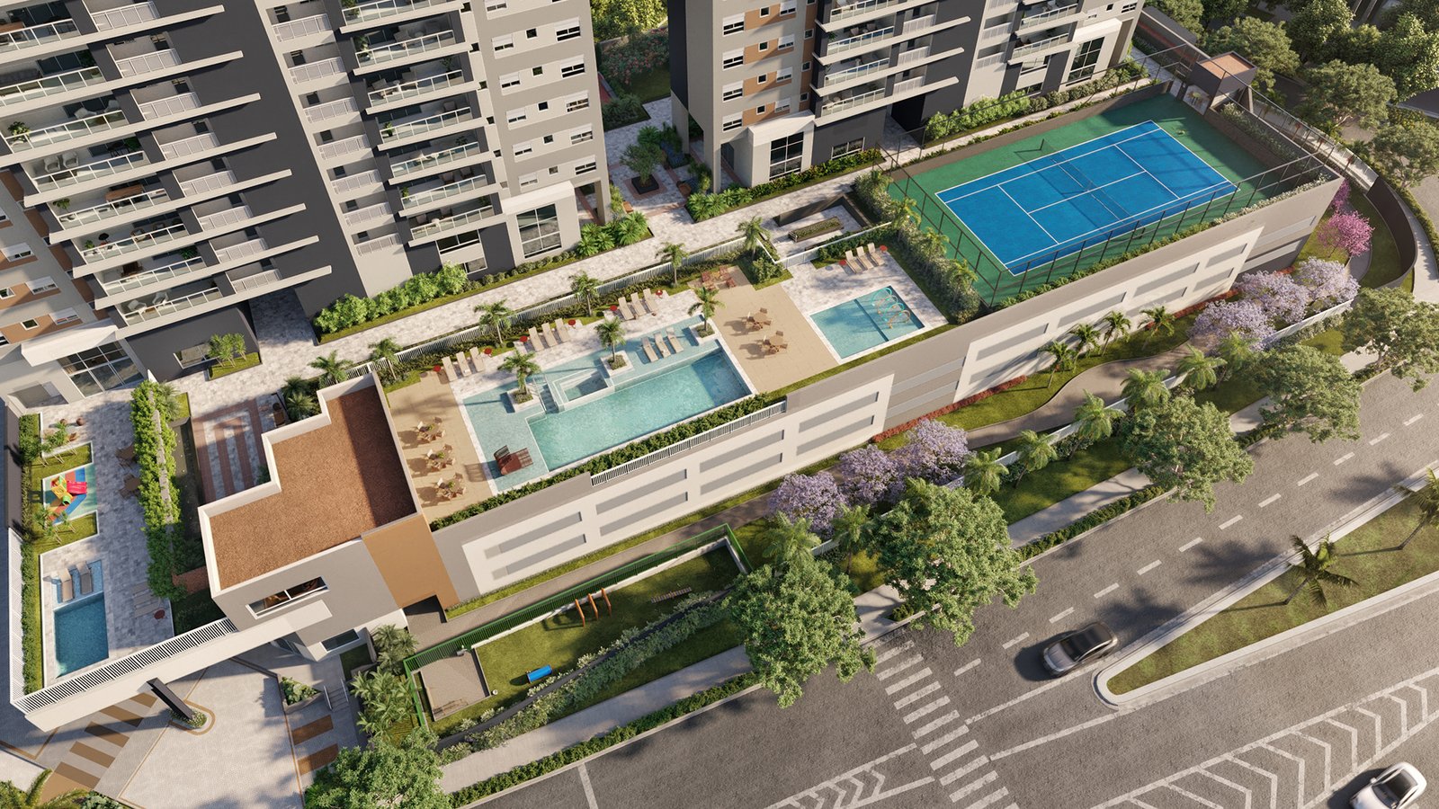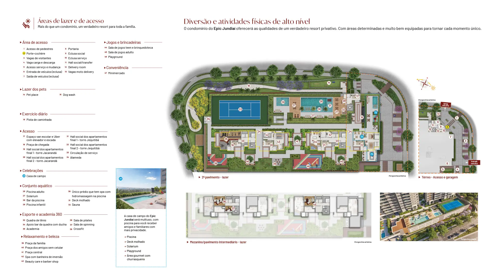 O Epic não possui garagens subterrâneas, todos os andares estarão acima do nível do solo. Por não possuir garagem subterrânea, a área de lazer do Epic Jundiaí, incluindo as piscinas, estará bem elevada em relação ao nível da rua, trazendo muita privacidade.